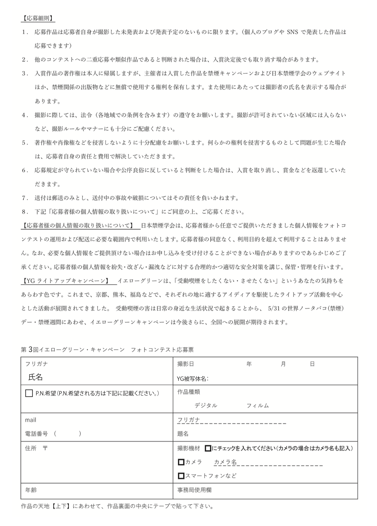 応募方法 :作品の裏に必要事項を記入した応募票を貼付し、送付は郵送のみとします応募票 :①作品名②撮影日③撮影YG被写体名④撮影機材⑤郵便番号・住所・氏名(P.N.)・電話番号・メールアドレス・年齢 (下をご参照下さい。コピーをしてお使い下さい)